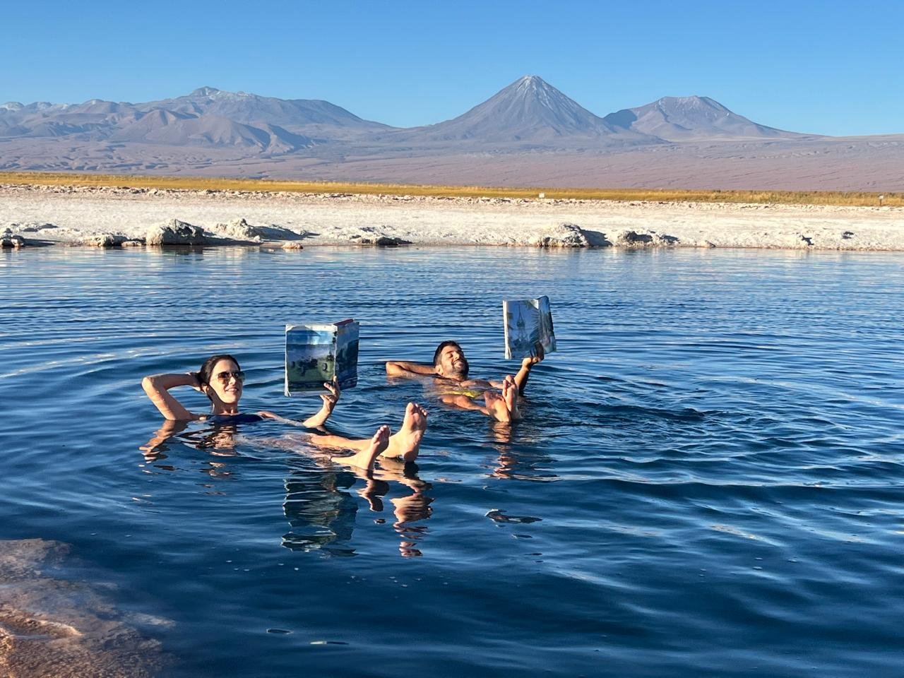 Na parte da tarde fomos para a Laguna Cejar, a mais salgada do mundo! Com mais sal que o Mar Morto, o legal é ficar boiando mesmo. Nem pense em mergulhar, o seu olho não vai conseguir abrir depois. A laguna tem uma boa estrutura de banheiro, com duchas de água doce, já que você fica branquinho de sal. A Ayllu oferece um roupão maravilhoso para ninguém passar frio, já que a água na laguna é gelada.