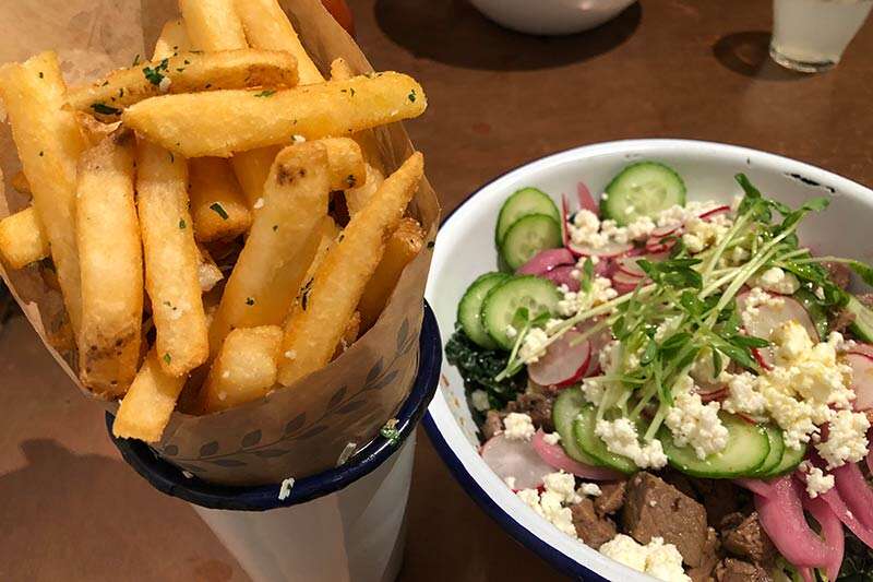 O tempero é uma delícia e as saladas valem por uma refeição, porque são compostas por mix de folhas com diversos ingredientes como iogurte grego, tomate cereja, cebola roxa, rabanete, pepino e queijo feta. Os pratos custam entre $15-17, e quem estiver com muita fome pode pedir acompanhamentos adicionais.